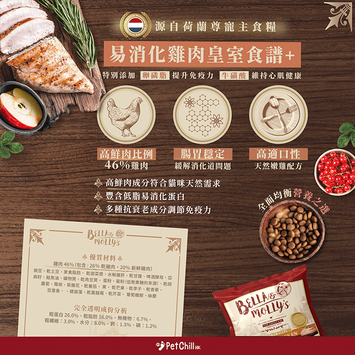 Bella & Molly's 的貓糧系列是為滿足貓咪肉食天性而設計的。其乾糧產品以「高比例肉類、無穀及低敏配方」為核心,確保貓咪獲得充足的蛋白質來源,同時避免常見的過敏原。配方中還特別添加了多款抗氧化級超級食材,如蔓越莓、藍莓等,以支持貓咪的免疫系統和整體健康。從試食裝到大包裝,多樣化的選擇讓寵物主人能根據貓咪的喜好和家庭需求進行選擇。這些貓糧均在荷蘭合規認證的廠房生產,符合AAFCO的營養標準,確保食品的安全性與營養均衡。
