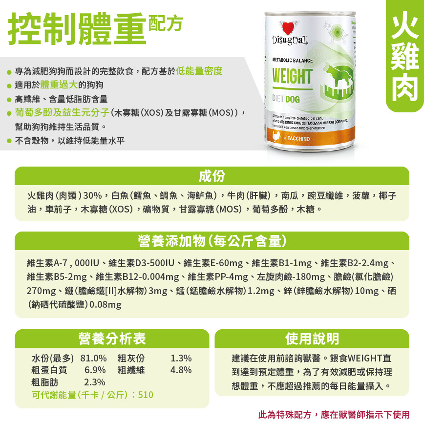 Disugual 意極鮮 處方糧 狗罐頭 控制體重配方 火雞 400g (DSDT071) | 意大利製造