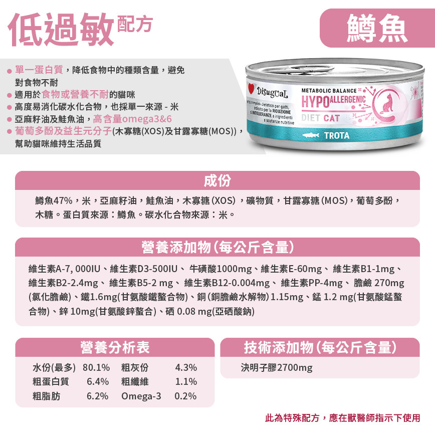 愛貓消化不良?Disugual 意極鮮處方糧貓罐頭,低敏配方鱒魚85g,專為敏感貓咪設計,意大利製造。有效緩解過敏,促進消化健康。立即選購,限時秒殺優惠,正貨保證! Disugual 意極鮮 處方糧 貓罐頭 低敏配方 鱒魚 85g (DSDTG003 | 意大利製造 - 限時優惠價