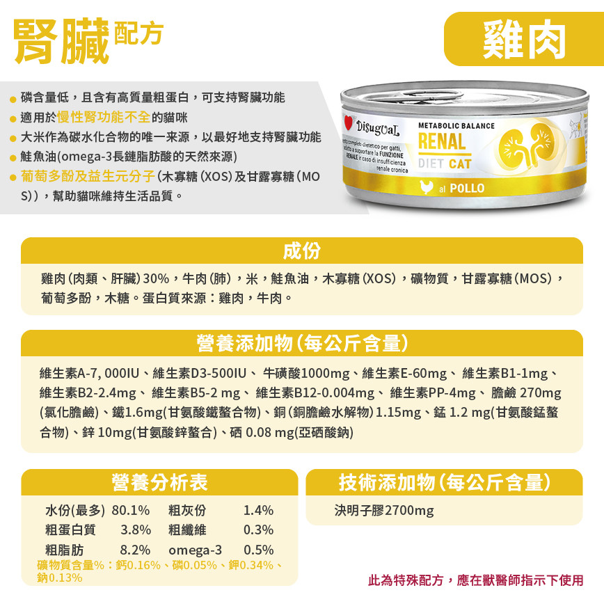 優質營養!Disugual 貓罐頭 腎臟配方,專為患有慢性腎臟病的成貓設計,含豐富雞肉。來自意大利製造,提供均衡營養,幫助貓咪維持健康。香港人氣好評,限時免費罐頭小食即送,立即選購! Disugual 意極鮮 處方糧 貓罐頭 腎臟配方 雞肉 85g (DSDTG050) | 意大利製造 - 限時優惠價