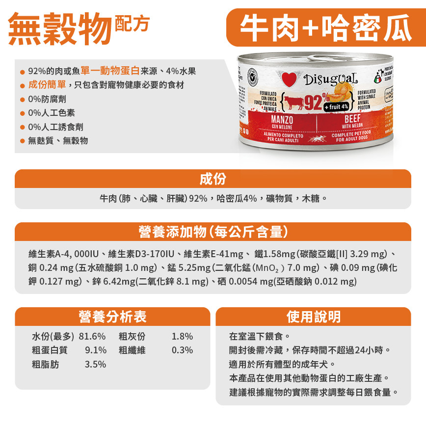 Disugual 意極鮮 狗罐頭 狗主食罐 92%鮮肉 無穀物牛肉及哈密瓜 150g (FRUT104) | 意大利製造