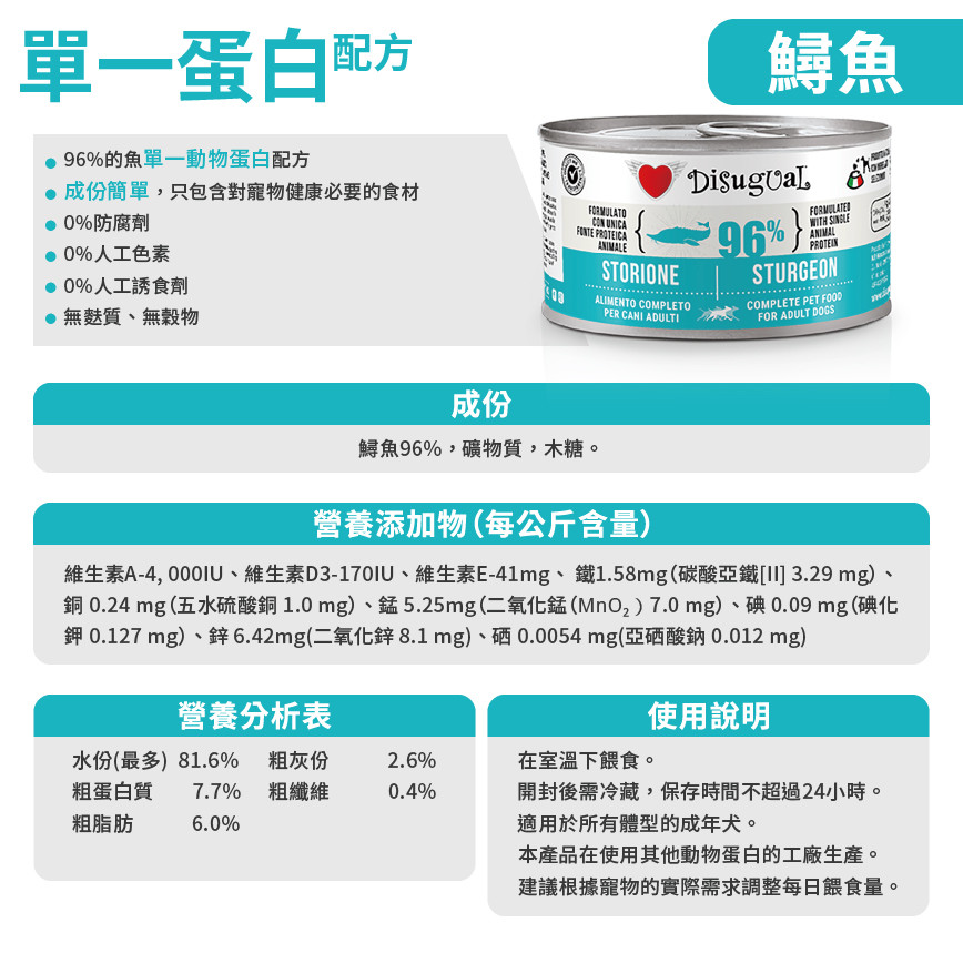 Disugual 意極鮮 狗罐頭 狗主食罐 96%極品鮮肉 單一蛋白配方 鱘魚 150g | 意大利製造