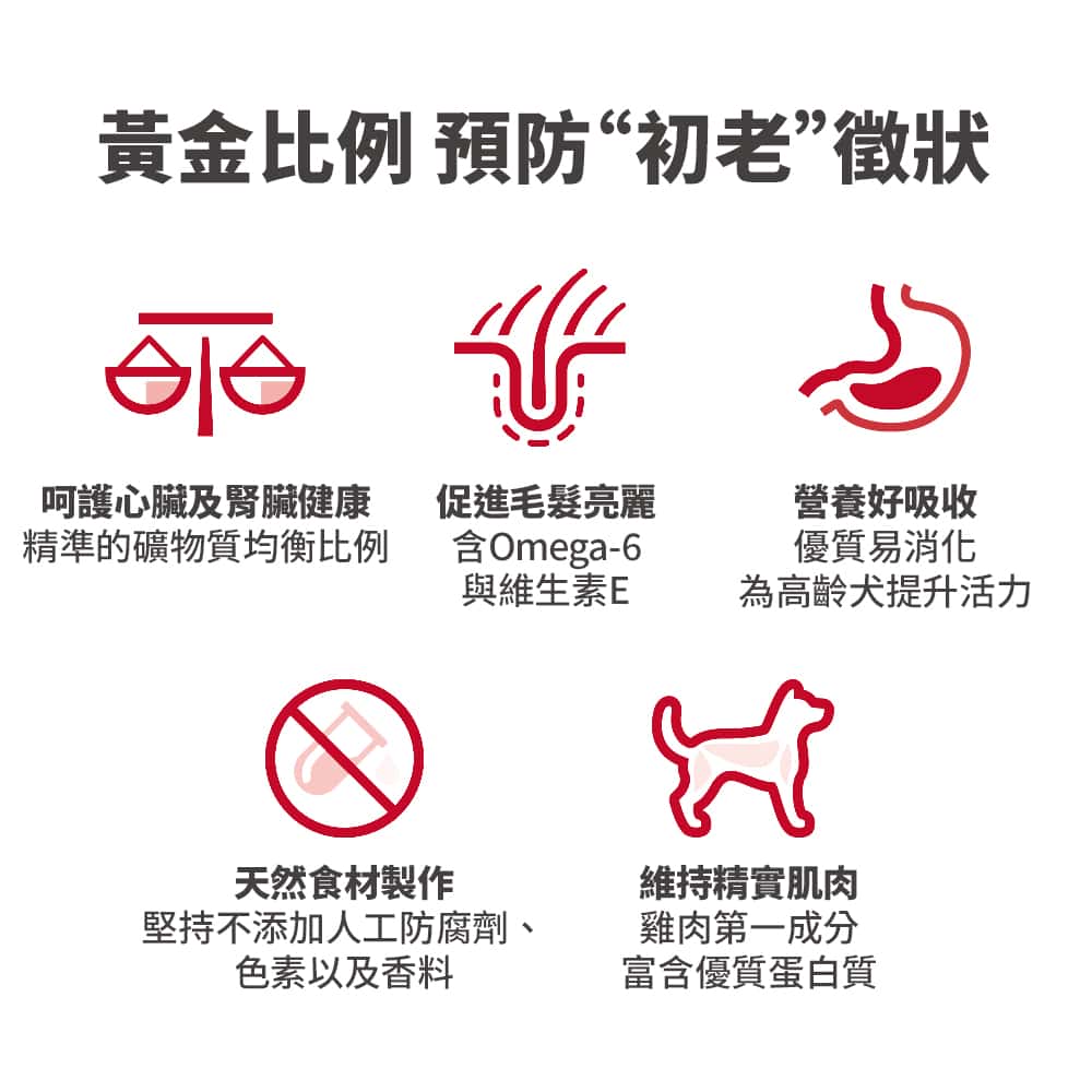 希爾思™寵物食品 成犬7歲以上是適合高齡犬特殊需求的配方。在特殊混合配方下提供易消化的營養成份,有助於增加精力與活動力。