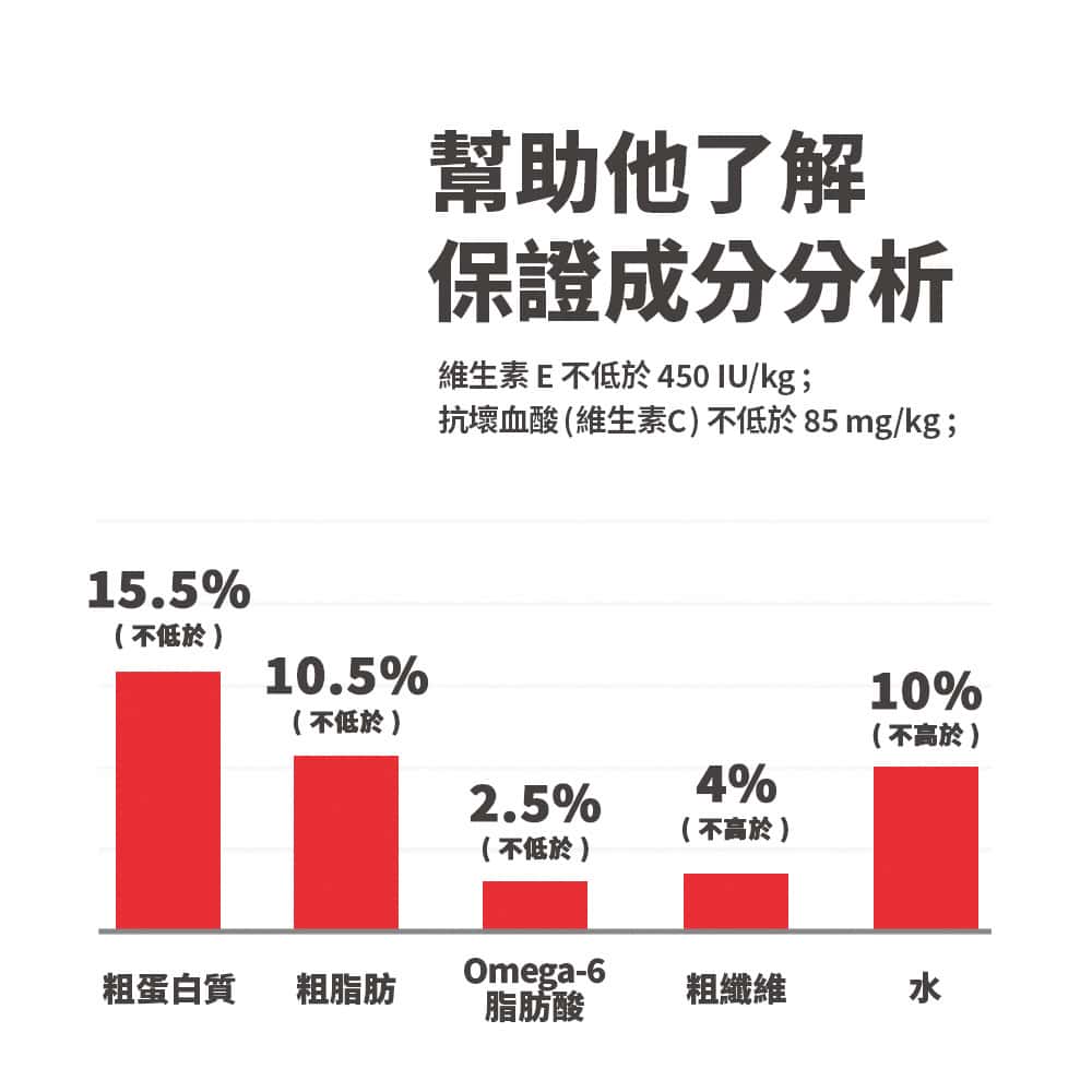 雞粉、碎珍珠大麥、啤酒米、全谷物小麥、全谷物玉米、全谷物高粱、全谷物燕麥、雞脂肪、幹甜菜漿、豆粕、雞肝香精、大豆油、乳酸、亞麻籽、氯化鉀、碳酸鈣、碘鹽、氯化膽堿、維生素(維生素E補充劑、l-抗壞血酸-2-聚磷酸酯(維生素C的來源)、煙酸補充劑、單硝酸硫胺素、維生素A補充劑、泛酸鈣、核黃素補充劑、生物素、維生素B12補充劑、鹽酸吡哆醇、葉酸、維生素D3補充劑)、l -賴氨酸、礦物質(硫酸亞鐵、氧化鋅、硫酸銅、氧化錳、碘酸鈣、亞硒酸鈉)、牛磺酸、dl -蛋氨酸、燕麥纖維、用於保鮮的混合生育酚、天然香料、左旋肉堿、β -胡蘿卜素、蘋果、西蘭花、胡蘿卜、蔓越莓、青豆。