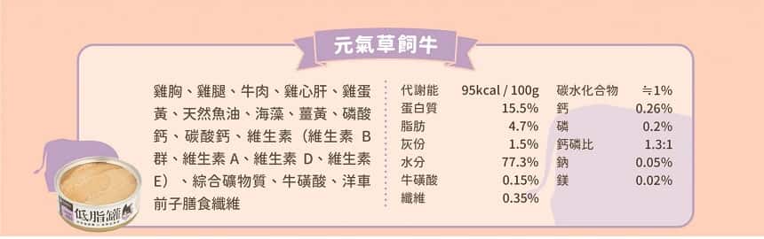 作為寵物營養師,在分析汪喵星球這款「貓咪低脂主食罐(元氣草飼牛)」後,我認為這是一款針對需要體重管理的成貓所設計的優秀產品。從營養成分表來看,其最大的特點在於極低的脂肪含量(4.7%)與極低的碳水化合物(約1%),同時保持了15.5%的優質蛋白質含量。這符合貓科動物作為肉食性動物的生理需求,特別適合那些活動量較低或有肥胖困擾的室內貓。 成分方面,產品以雞胸、雞腿和牛肉為主要蛋白質來源,屬於優質的動物性蛋白。配方中特別添加了洋車前子膳食纖維,這對於減重期間的貓咪來說非常有益,能提供飽足感並幫助腸道蠕動。此外,成分中還包含了天然魚油、海藻和薑黃,這些都是對皮膚、毛髮及整體免疫力有益的天然食材。 在礦物質平衡上,鈣磷比控制在1.3:1的理想範圍內,0.05%的低鈉含量也減輕了腎臟負擔。牛磺酸含量達0.15%,充足的牛磺酸對貓咪的心臟和視力健康至關重要。熱量方面為95kcal/100g,屬於適中偏低的熱量密度,讓飼主在控制貓咪熱量攝取的同時,不需大幅減少餵食份量,避免貓咪產生飢餓感。 總結來說,這款主食罐不僅符合AAFCO與NRC的成貓營養標準,更精準地解決了現代家貓常見的肥胖問題,是一款配方科學、營養均衡的功能性主食罐。
