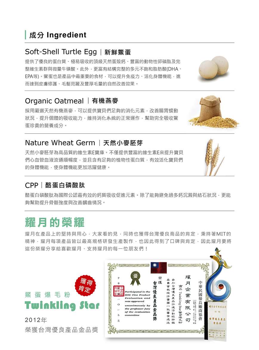 ✓ 唯一獲得台灣優良產品金獎之鱉蛋爆毛粉