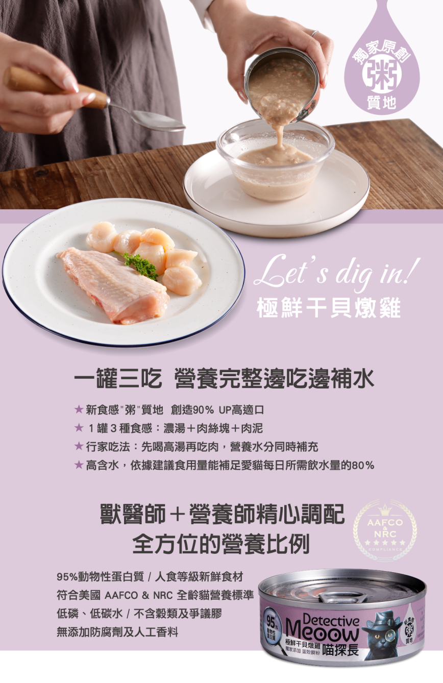 「喵探長」的主食罐系列以其獨特的「粥」質地和豐富的口感層次脫穎而出,市場首創的「濃湯、肉絲、肉泥」三種食感混合,旨在提升貓咪的適口性,特別適合挑食或口腔敏感的貓咪。