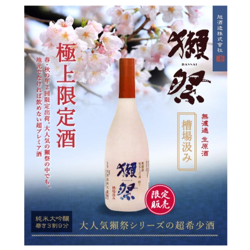 此瓶清酒每年只限售2次,是非常珍貴的限售品。以山田錦米精米步合度三割九分釀成,是無過濾的生原酒。「槽場汲み」的意思是從剛釀好的新酒中央位置抽取出來的酒;而獺祭每年只會在春天和秋天進行這樣的操作。入口清新甘美,香氣濃郁,果實香強烈;建議座冰冷飲。