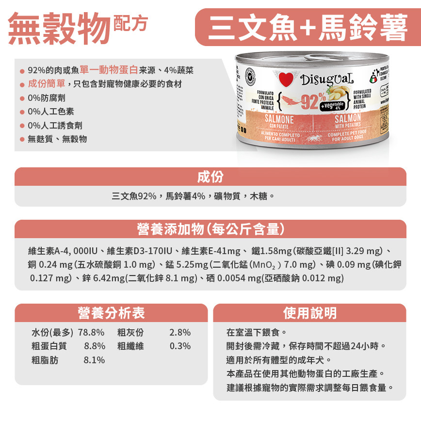優質營養 Disugual 狗主食罐,92%鮮肉無穀物三文魚及馬鈴薯配方,意大利製造。這款 Disugual 鮮肉狗罐頭,為您的愛犬提供均衡營養,尤其適合挑食或腸胃敏感的狗狗。立即選購,享至抵價格保證! Disugual 意極鮮 狗罐頭 狗主食罐 92%鮮肉 無穀物三文魚及馬鈴薯 150g (DSBL106) | 意大利製造