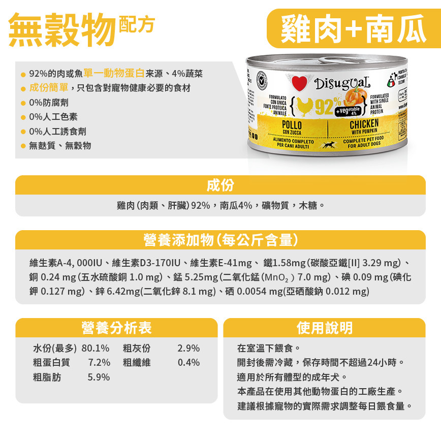 正貨保證!Disugual 意極鮮狗罐頭,92%鮮肉無穀物雞肉及南瓜配方,150g全齡狗主食罐,義大利製造,為愛犬提供完整均衡營養。解決挑食問題,促進消化健康。立即選購,PetChill 香港最大寵物用品網店,會員享免費贈品! Disugual 意極鮮 狗罐頭 狗主食罐 92%鮮肉 無穀物雞肉及南瓜 150g (DSBL105) | 意大利製造