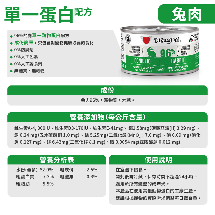 正貨保證!Disugual 意極鮮狗主食罐,96%極品鮮肉單一蛋白兔肉配方,專為狗狗設計。150g 重量,意大利製造,提供頂級營養。解決挑食問題,促進消化健康。立即選購,滿額免費貓狗飲水機! Disugual 意極鮮 狗罐頭 狗主食罐 96%極品鮮肉 單一蛋白配方 兔肉 150g (DSGV107 | 意大利製造