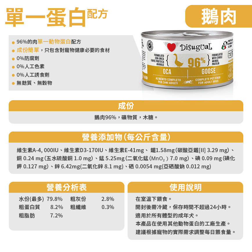 優質營養!Disugual 96%鮮肉 狗罐頭,精選鵝肉單一蛋白配方,專為狗狗設計。意大利製造,150g包裝,確保消化健康。立即選購,新會員三連送,讓您的毛孩享受頂級美食體驗! Disugual 意極鮮 狗罐頭 狗主食罐 96%極品鮮肉 單一蛋白配方 鵝肉 150g (DSGV114) | 意大利製造