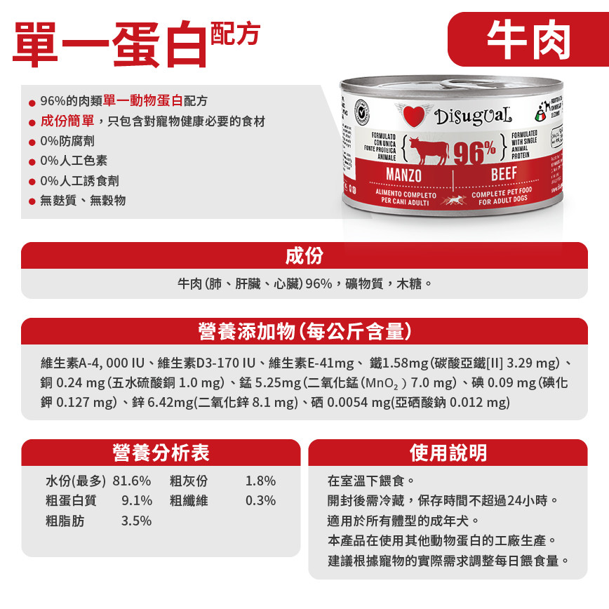 Disugual 意極鮮 狗罐頭 狗主食罐 96%極品鮮肉 單一蛋白配方 牛肉 150g (DSGV105) | 意大利製造