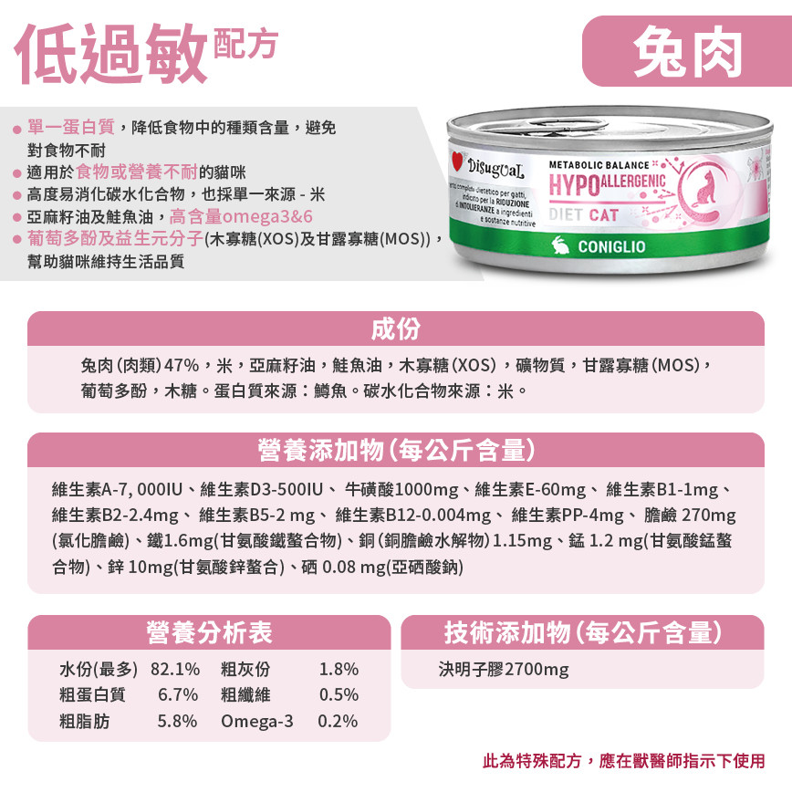 搶購中!Disugual 意極鮮處方糧貓罐頭,低敏兔肉配方85g,專為成貓設計。意大利製造,有效改善腸胃敏感,提供全面營養。正貨保證,立即選購,享限時優惠價!切勿錯過! Disugual 意極鮮 處方糧 貓罐頭 低敏配方 兔肉 85g (DSDTG002) | 意大利製造 - 限時優惠價