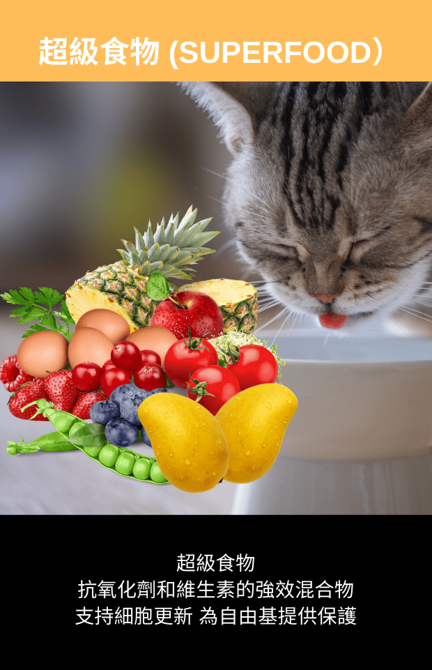 原料組成:雞肉粉、木薯、水解三文魚蛋白、馬鈴薯、豌豆、牛油、 雞、水解物、雞油、魚粉、纖維素、三文魚油、苜蓿、蛋、豌豆、橄欖油、番茄粉、芒果粉、菠蘿粉、藍莓粉、蔓越莓粉、樹莓粉、草莓粉、桑葚粉)、蘋果粉、香菜粉