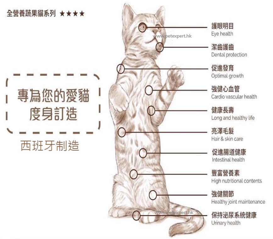 高蛋白及低脂肪完美比例,配合天然水果及蔬菜成份,適合絕育及過重成貓食用。
