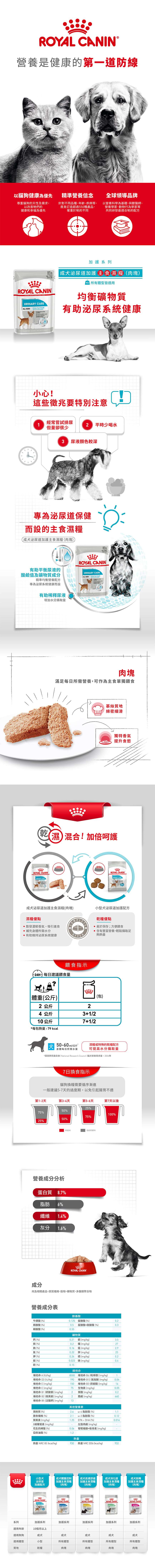 許多因素可能會導致成犬尿液濃度偏高,例如不足的水分攝取量等等。而當尿液中特定礦物質濃度增加,就可能產生尿結晶這種情況。這時刻,使用"Royal Canin法國皇家 狗糧 狗濕糧"的營養配方始見其最大的磨練,讓您的寵物得以獲得最健康的礦物質平衡,它可以用以有效防範這些敏感症狀。